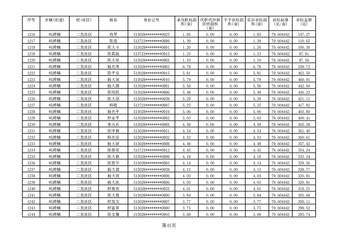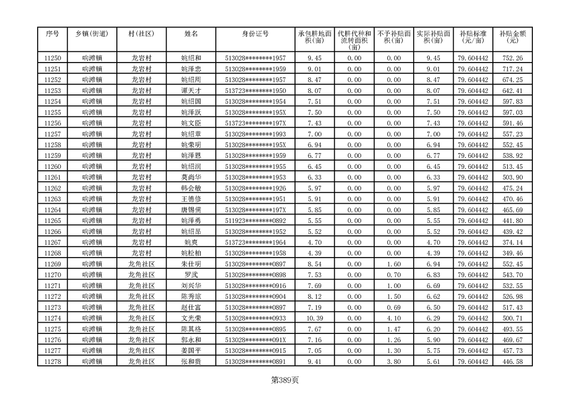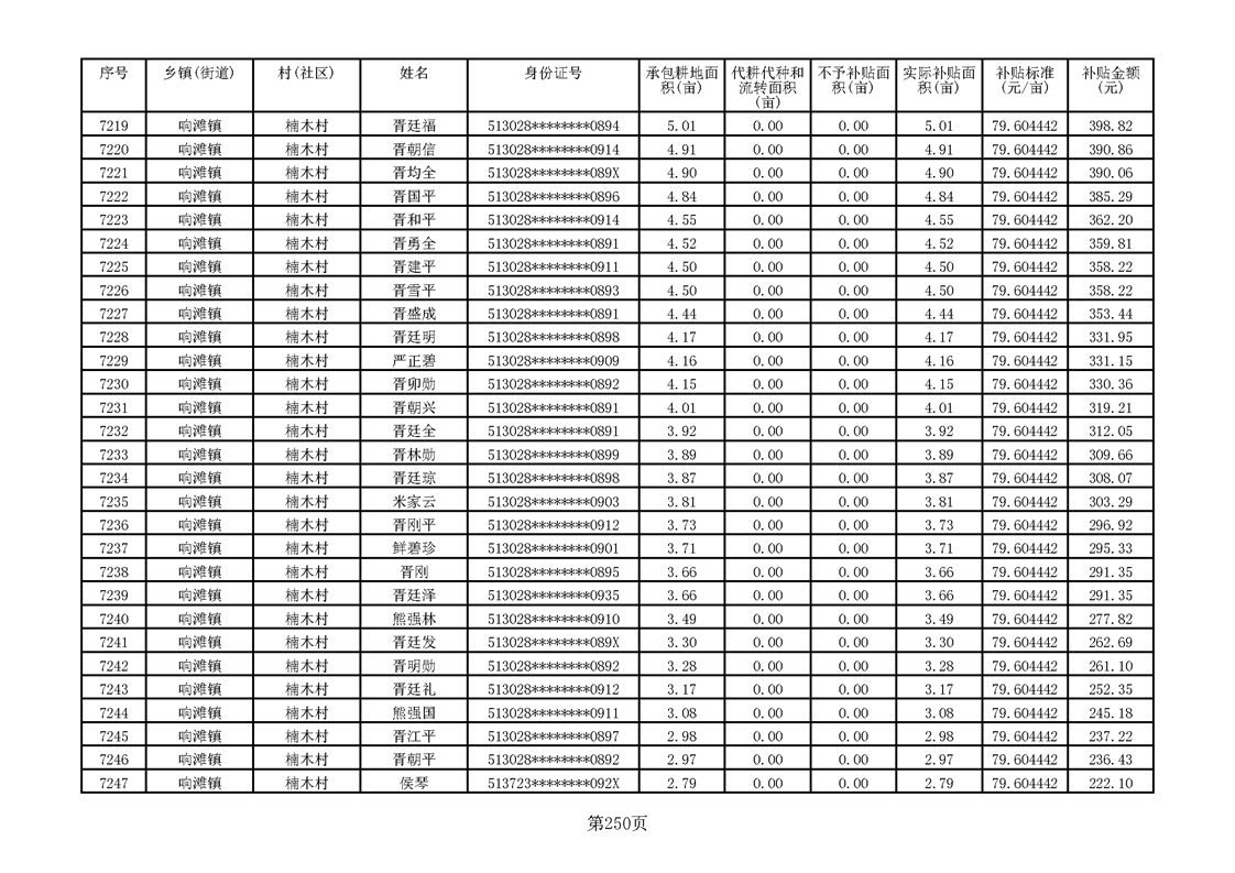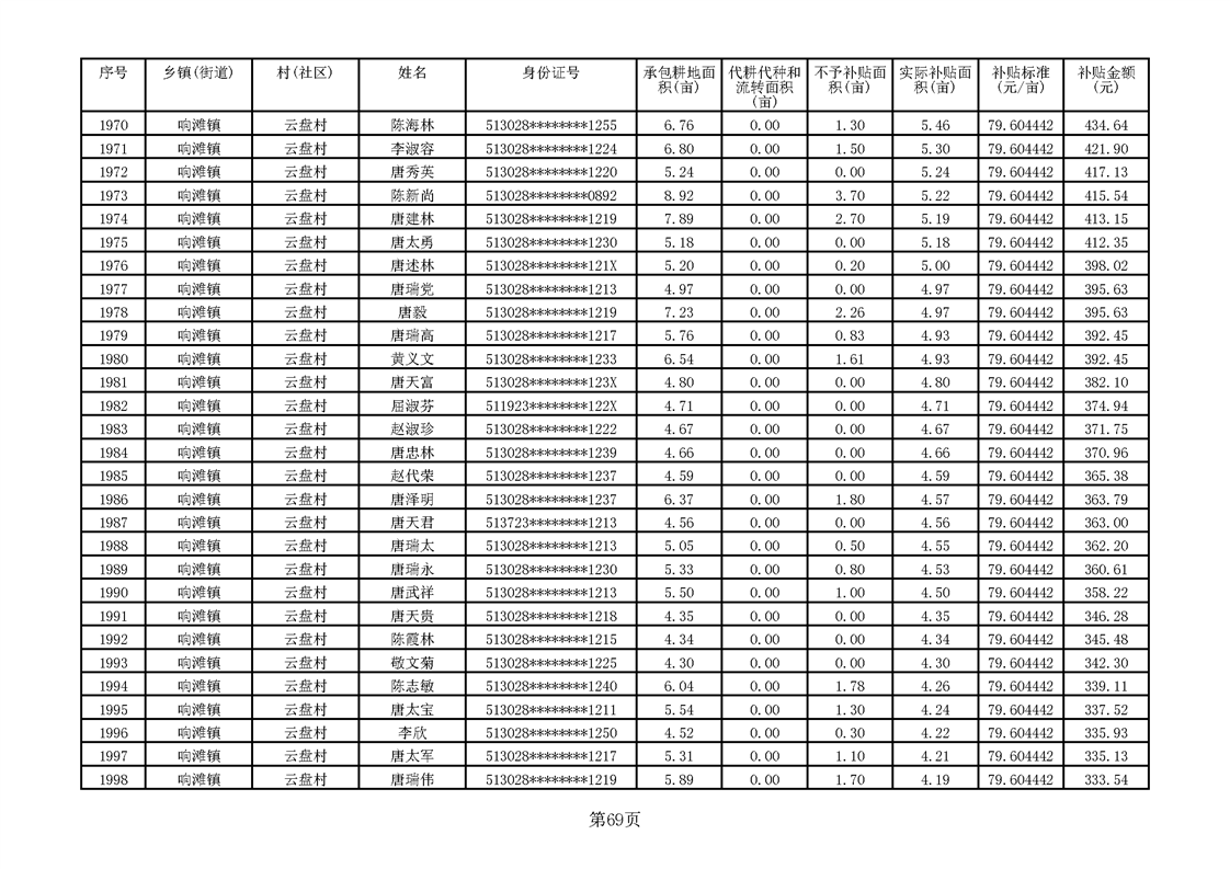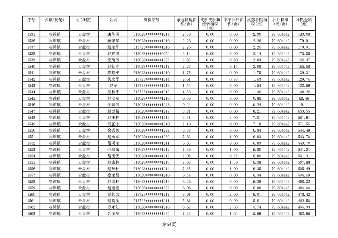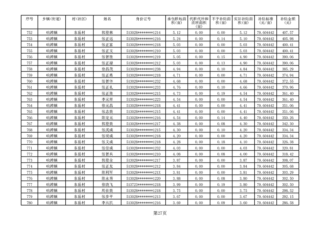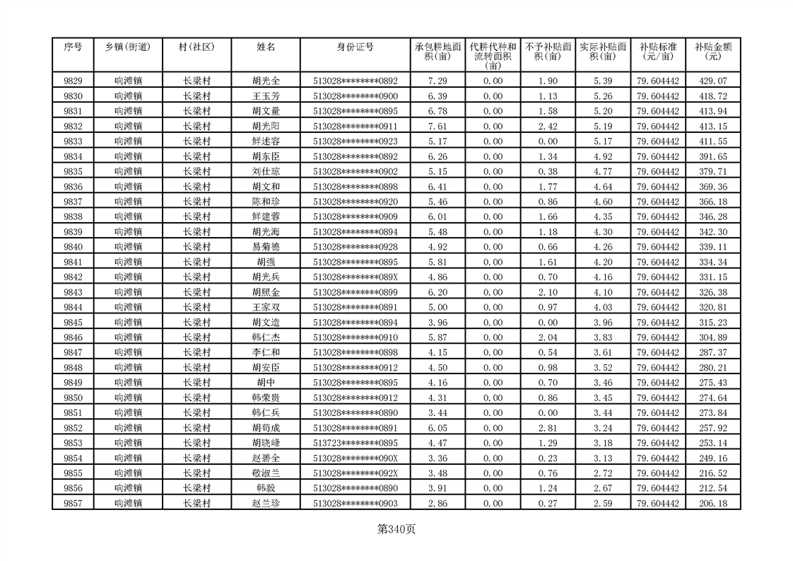 响滩镇2023年耕地地力保护补贴资金公示明细表