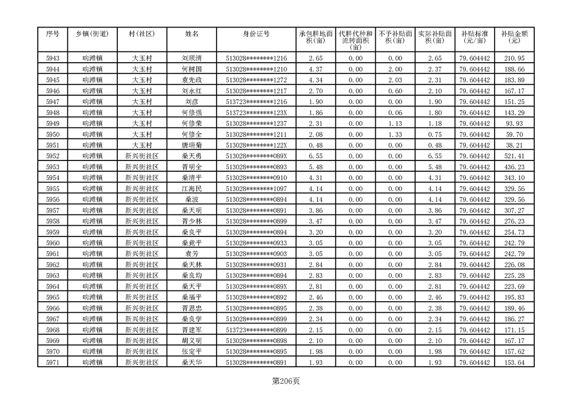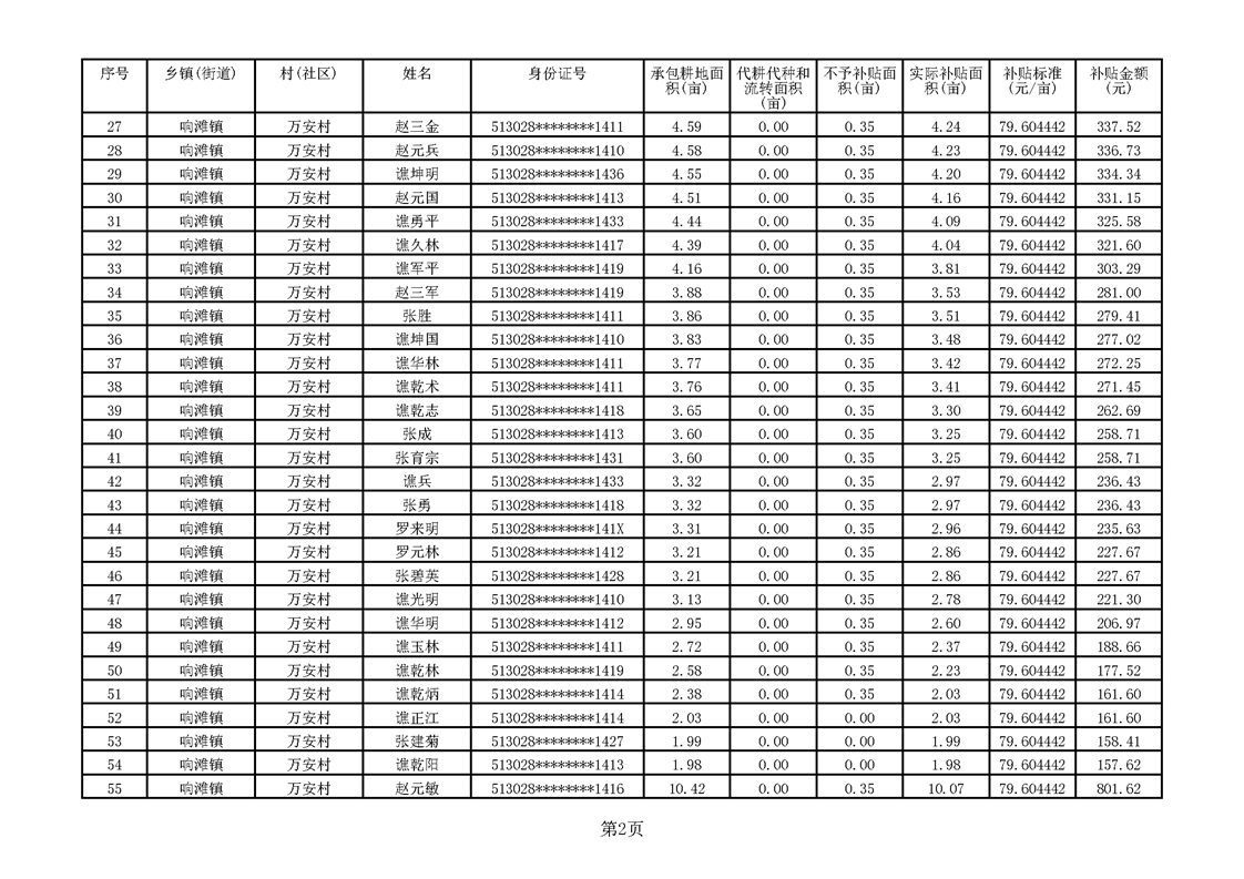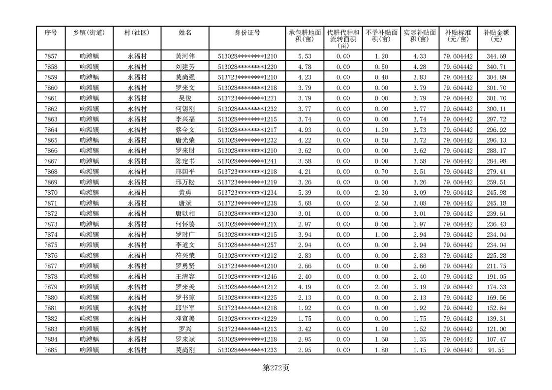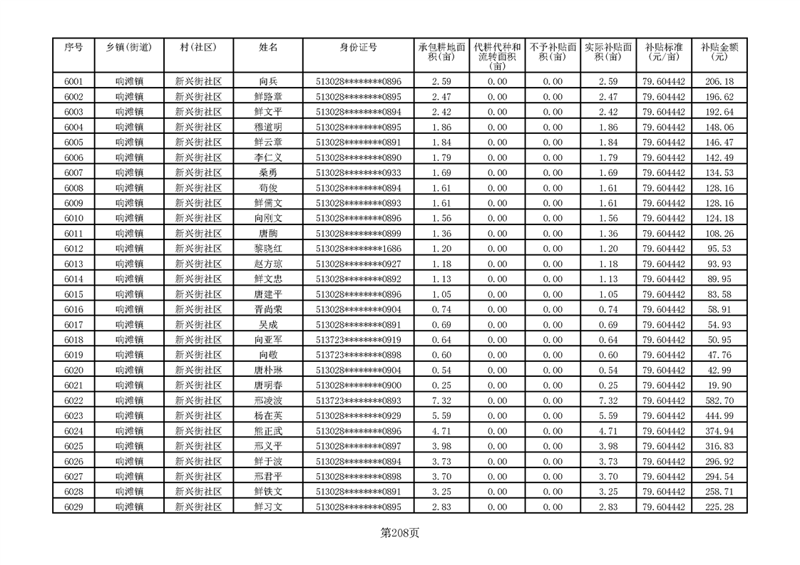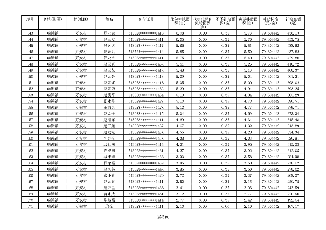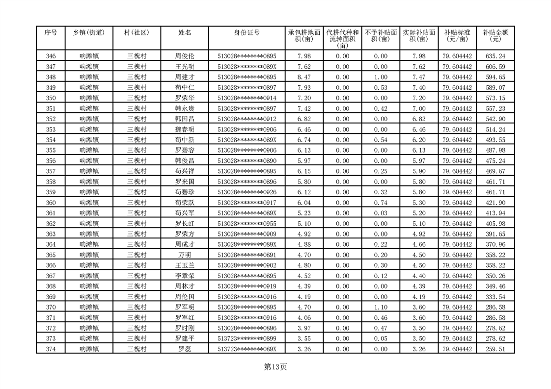 响滩镇2023年耕地地力保护补贴资金公示明细表