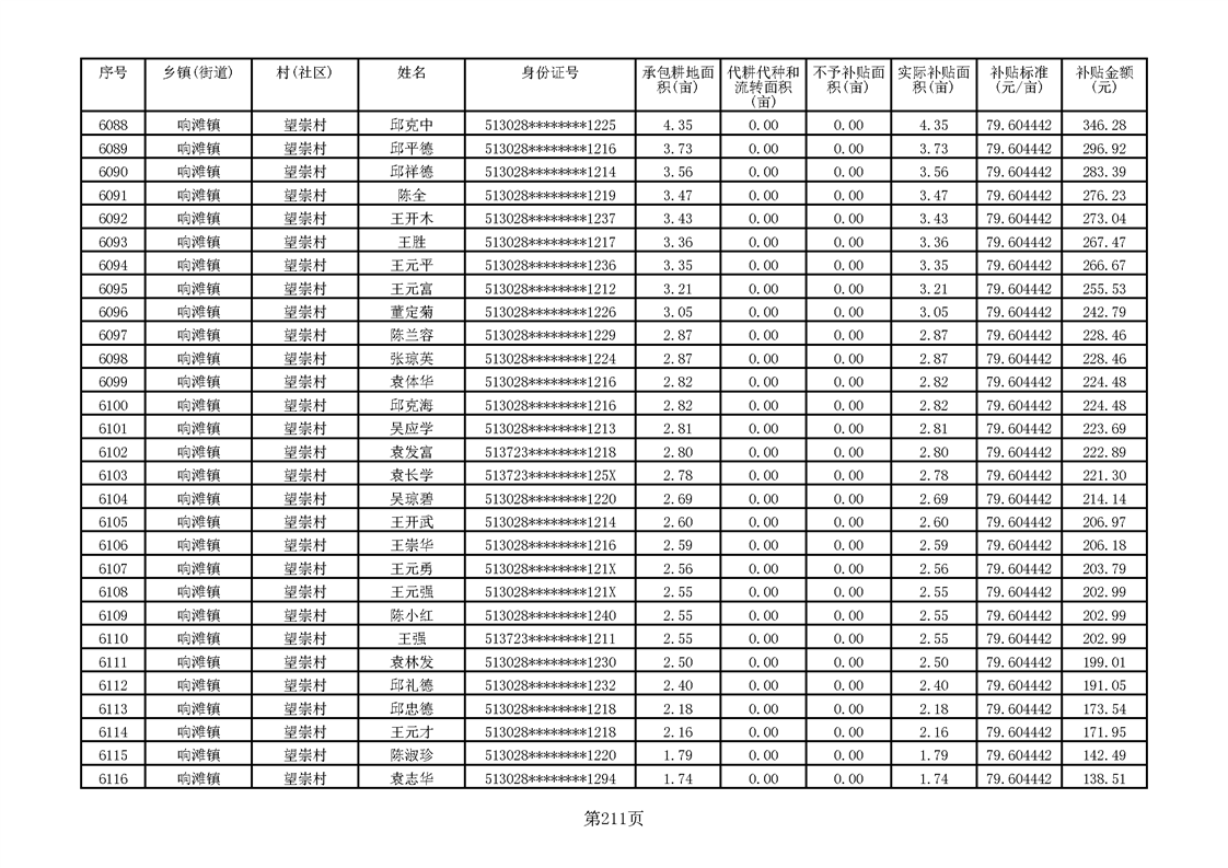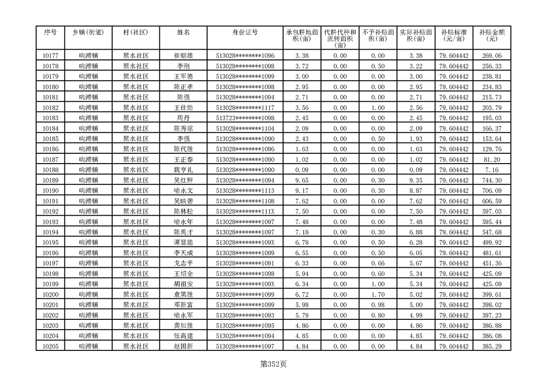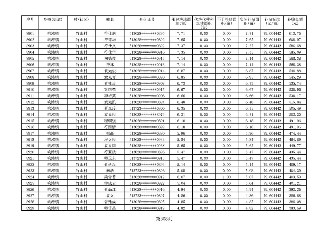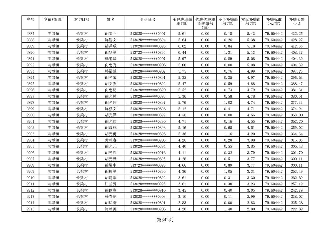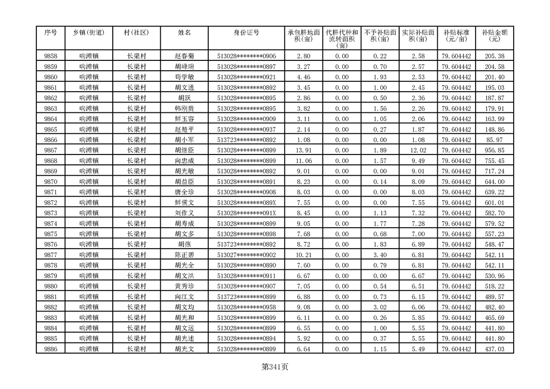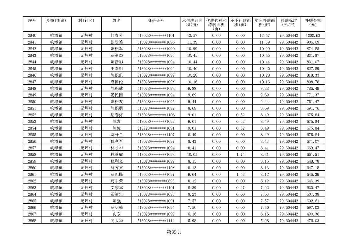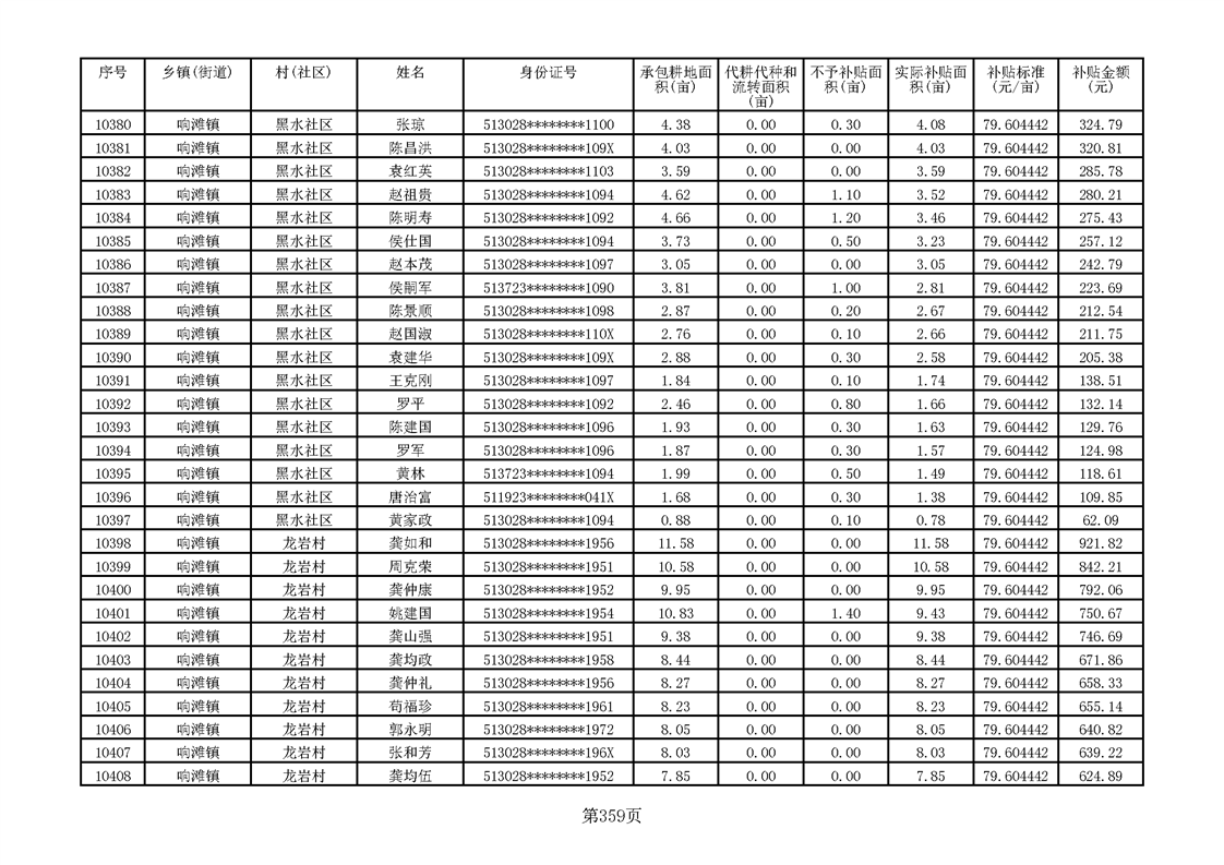 响滩镇2023年耕地地力保护补贴资金公示明细表