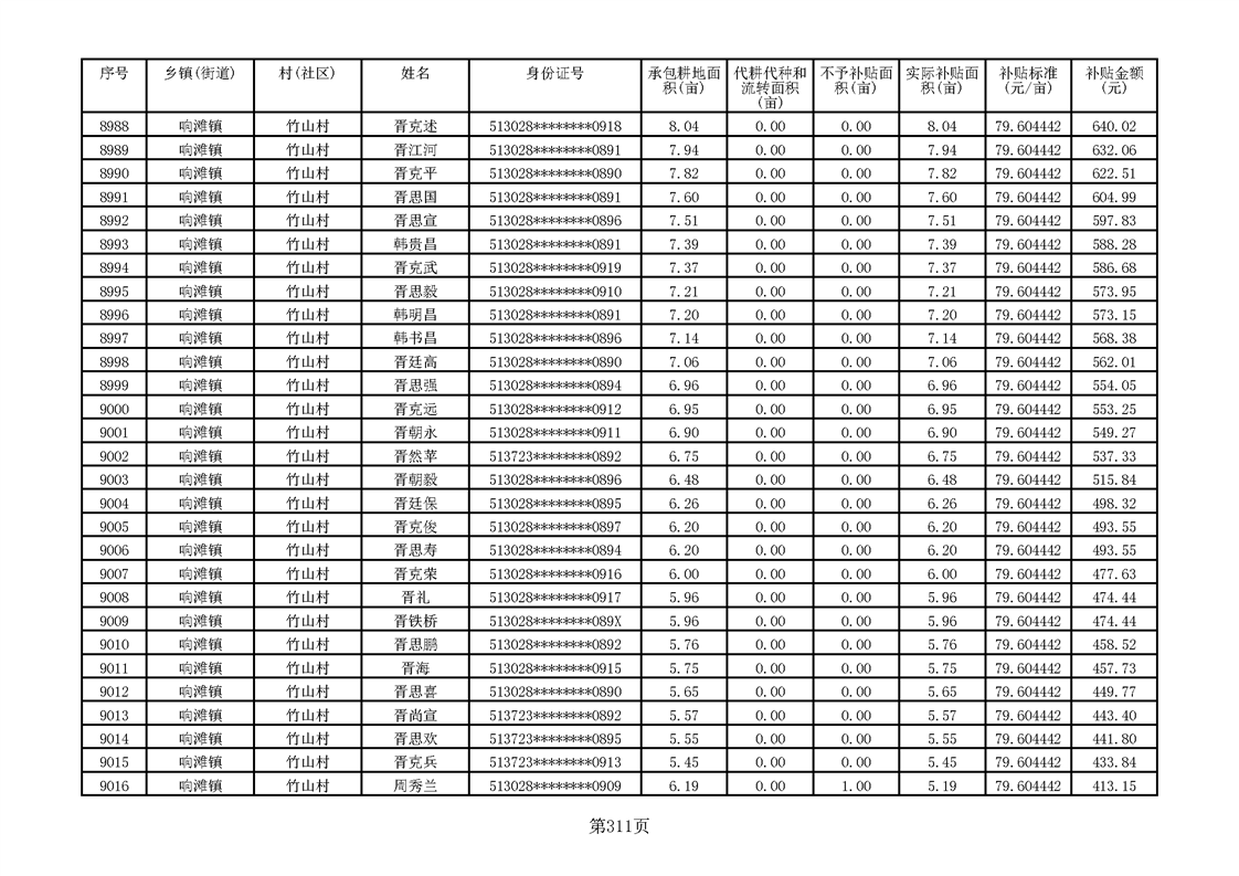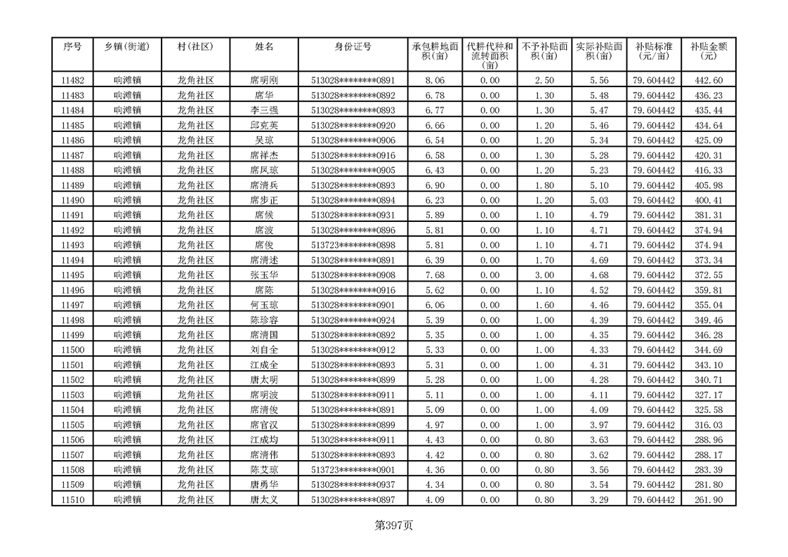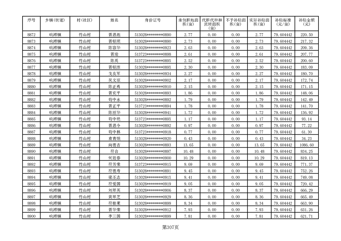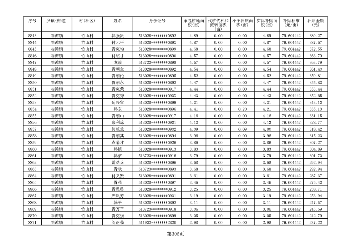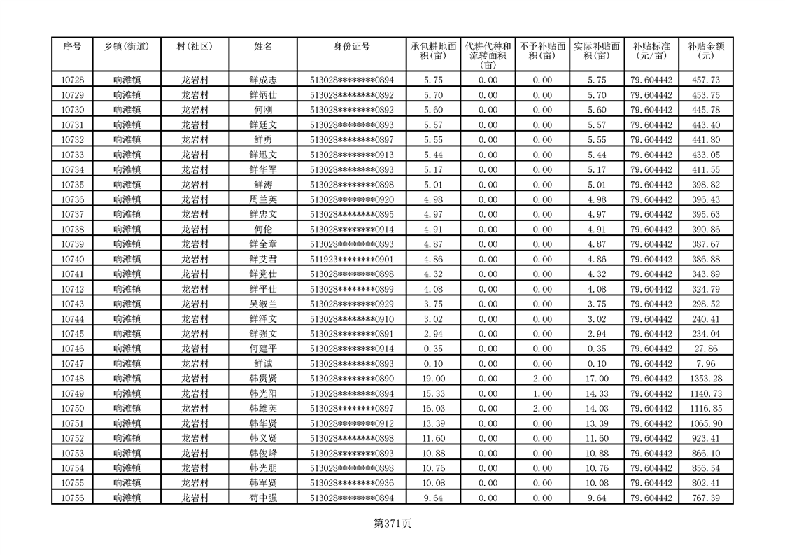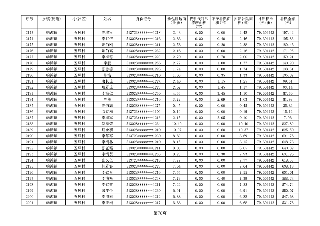 响滩镇2023年耕地地力保护补贴资金公示明细表