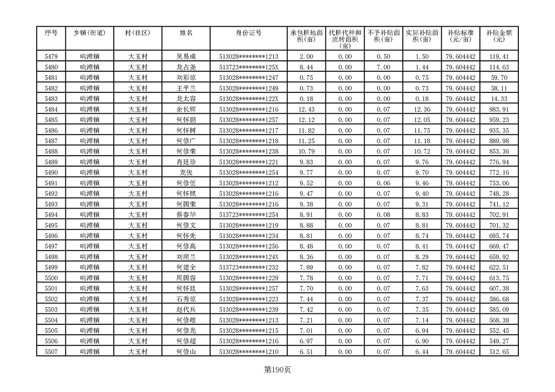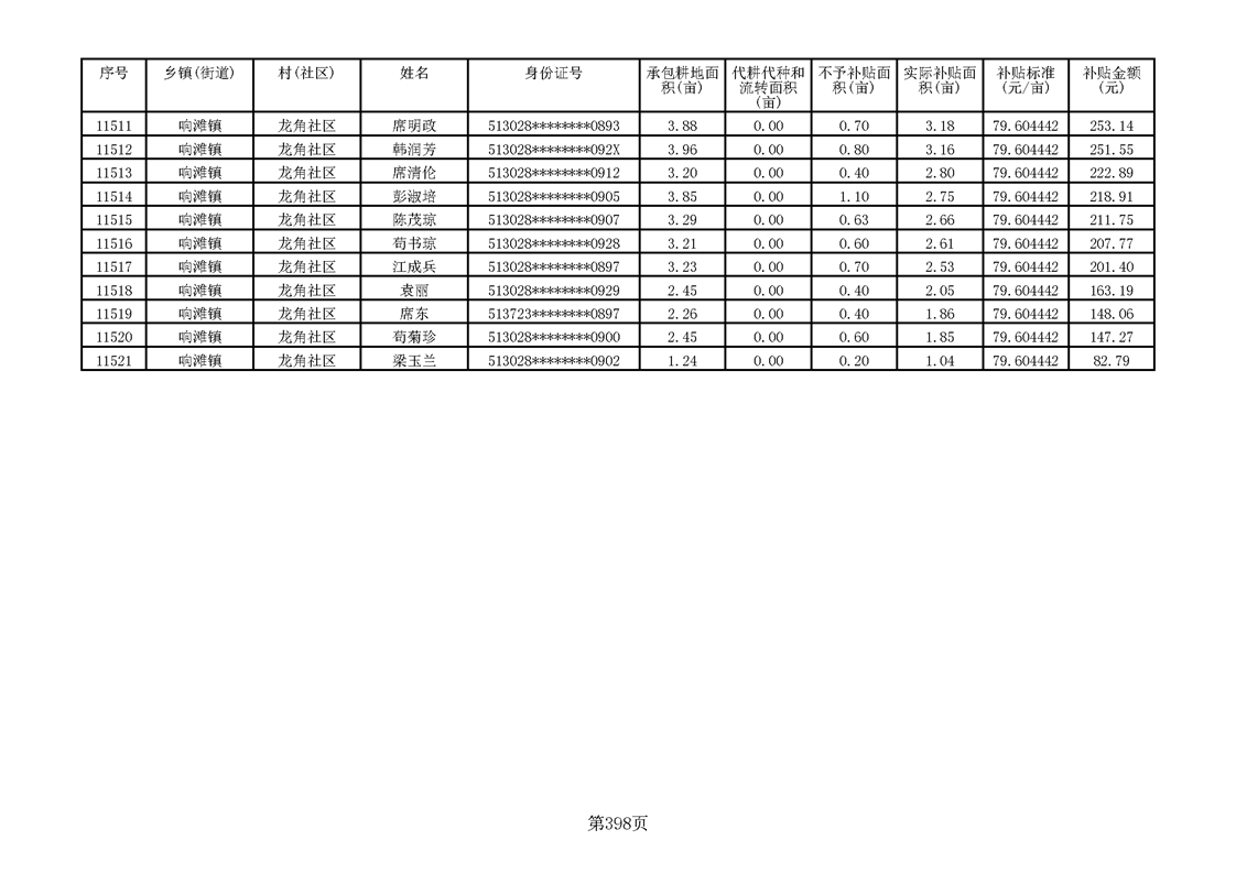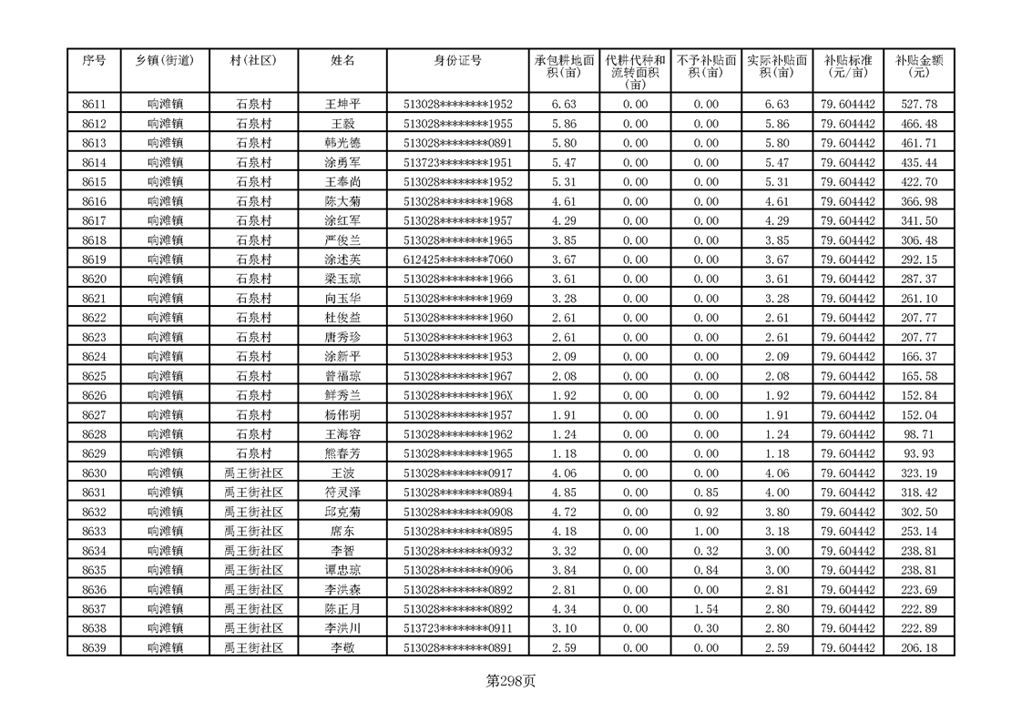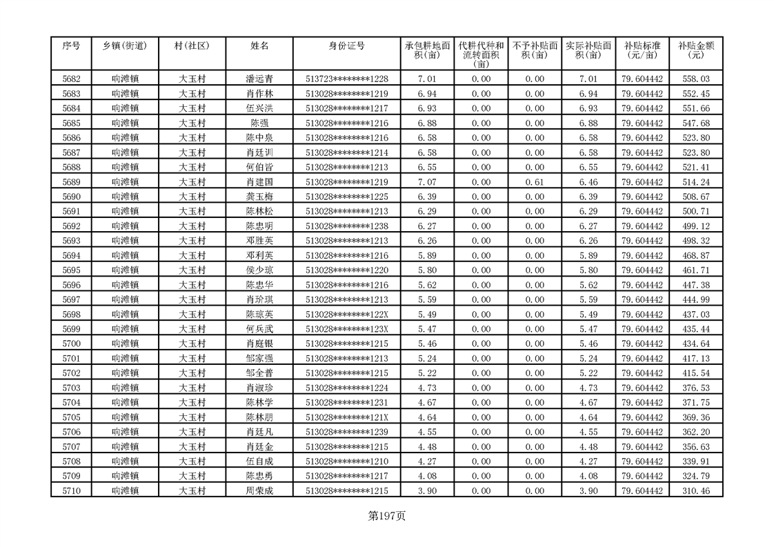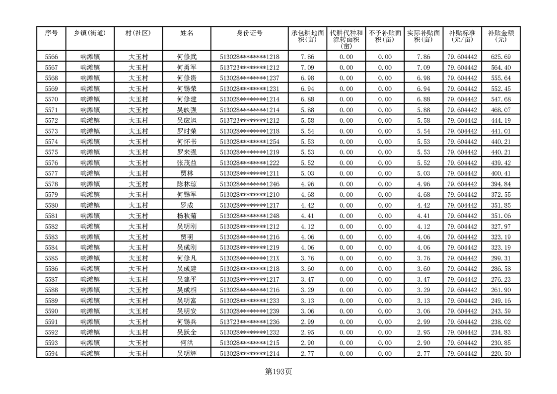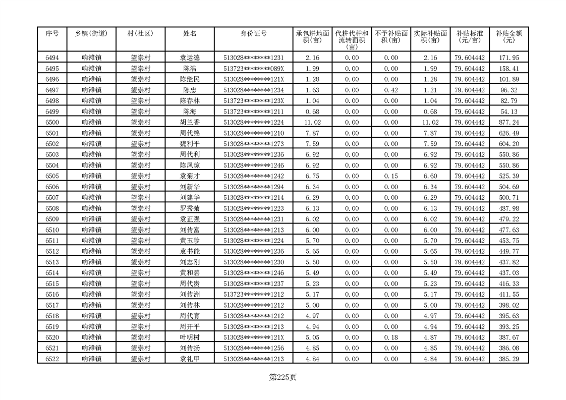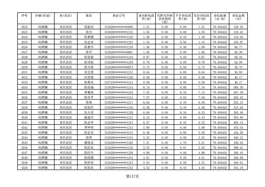 响滩镇2023年耕地地力保护补贴资金公示明细表