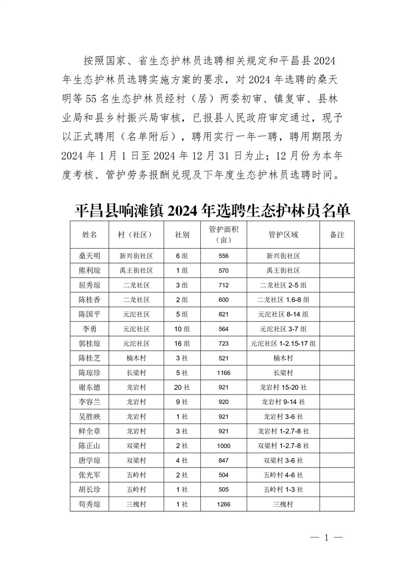 开云体育足球官网响滩镇2024年选聘生态护林员名单