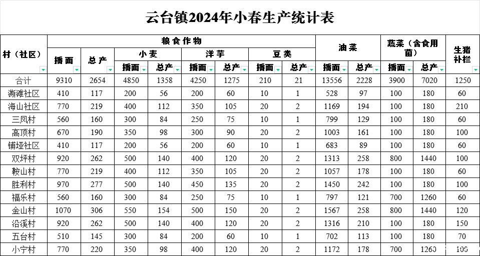 云台镇2024年小春生产统计