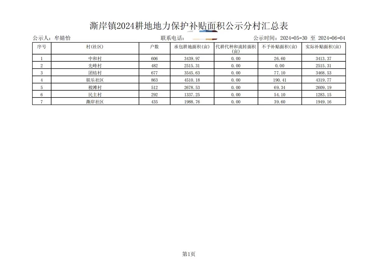 澌岸镇2024年耕地地力保护补贴面积分村汇总统计表