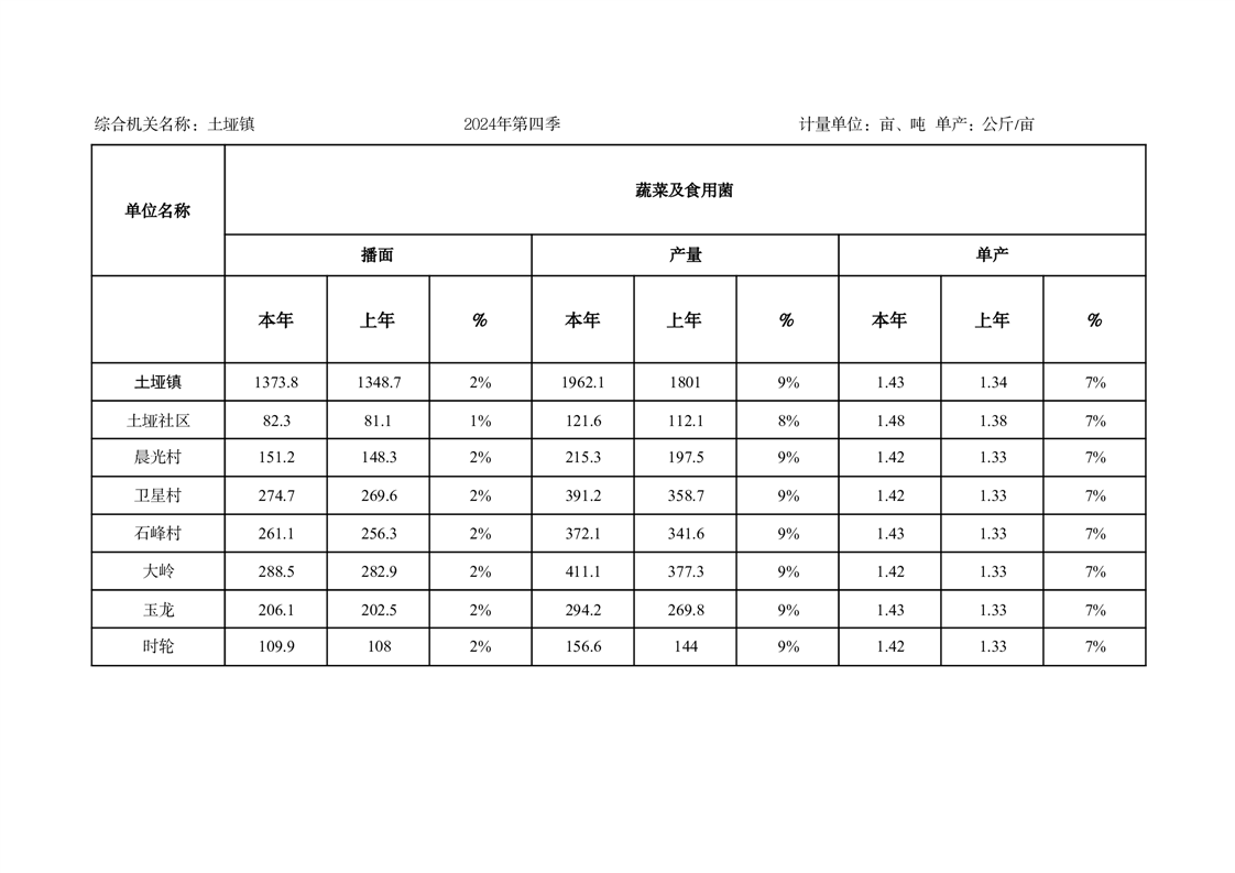 土垭镇2024年四季度蔬菜及食用菌统计数据