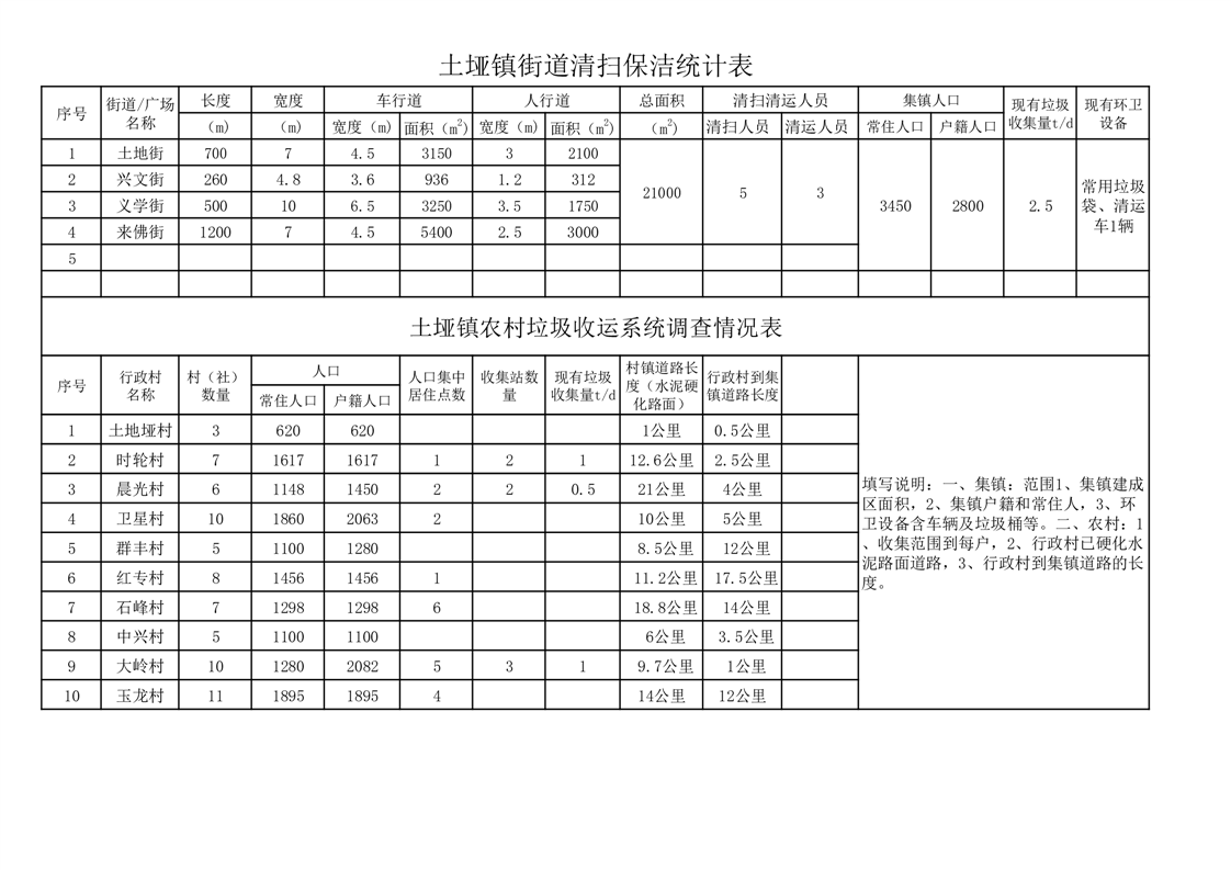土垭镇环卫一体化乡镇清扫保洁面积调查统计表