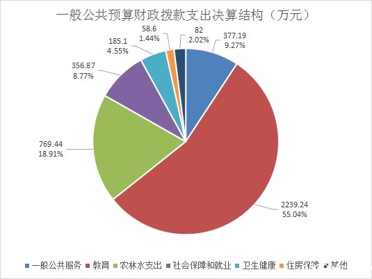 2021年一般公共预算财政拨款支出4068.45万元,主要用于以下方面:一般公共服务支出377.19万元,占9.27%;教育支出2239.24万元,占55.04%;农林水支出769.44,占18.91%;社会保障和就业支出356.87万元,占8.77%;卫生健康支出185.1万元,占4.55%;住房保障支出58.6万元,占1.44%;城乡社区支出16.37万元,占0.4%;文化旅游体育与传媒支出7.49万元,占0.18%;灾害防治及应急管理支出31万元,占0.76%;公共安全支出13.96,占0.34%;节能环保支出10万元,占0.25%;交通运输支出2.18万元,占0.05%;国防支出1万元,占0.02%。