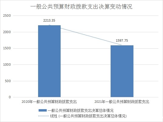 2021年一般公共预算财政拨款支出1597.75万元,占本年支出合计的88.89%。与2020年相比,一般公共预算财政拨款支出2213.35万元减少615.6万元,下降27.81%%。主要变动原因是脱贫攻坚阶段初步完成,农村危旧房改造、农村道路和水利等项目建设大量减少,由此形成支出总量大大减少。