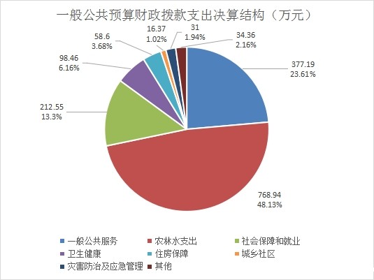 2021年一般公共预算财政拨款支出1597.75万元,主要用于以下方面:一般公共服务支出377.19万元,占23.61%;农林水支出768.94,占48.13%;社会保障和就业支出212.55万元,占13.3%;卫生健康支出98.46万元,占6.16%;住房保障支出58.6万元,占3.68%;城乡社区支出16.37万元,占1.02%;文化旅游体育与传媒支出7.49万元,占0.47%;灾害防治及应急管理支出31万元,占1.94%;公共安全支出13.96,占0.87%;节能环保支出10万元,占0.63%;交通运输支出2.18万元,占0.14%;国防支出1万元,占0.01%。