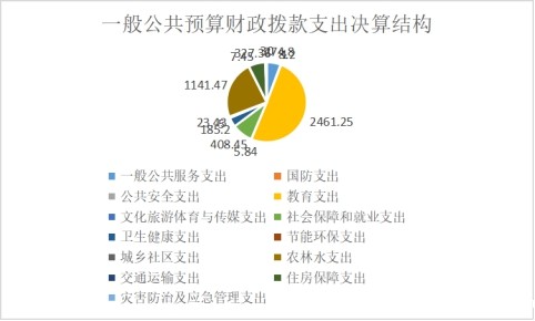 2021年一般公共预算财政拨款支出4879.45万元,主要用于以下方面:一般公共服务(类)支出274.80万元,占5.63%;国防支出(类)1.00万元,占比0.02%;公共安全(类)支出8.2万元,占比0.17%;教育支出(类)2461.25万元,占50.44%;文化旅游体育与传媒(类)支出5.84万元,占0.12%;社会保障和就业(类)支出408.45万元,占8.37%;卫生健康(类)支出185.2万元,占3.80%;节能环保(类)支出5万元,占比0.10%;城乡社区(类)支出23.43万元,占比0.48%;农林水(类)支出1141.47万元,占比23.39%;交通运输(类)支出7.45万元,占比0.15%;住房保障(类)支出327.36万元,占比6.71%;灾害防治及应急管理(类)支出30.00万元,占比0.61%。