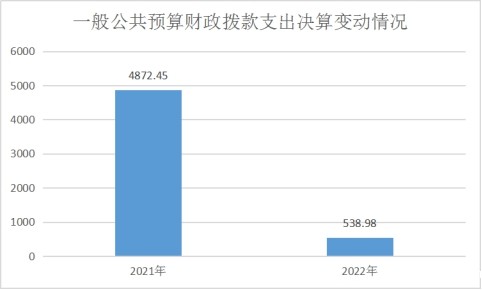 2022年一般公共预算财政拨款支出538.98万元,占本年支出合计的92.20%。与2021年相比,一般公共预算财政拨款支出减少4333.47万元,下降88.94%。主要变动原因是节流开支,财政收入减少。