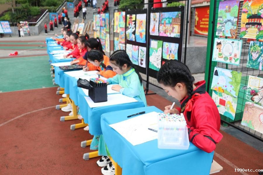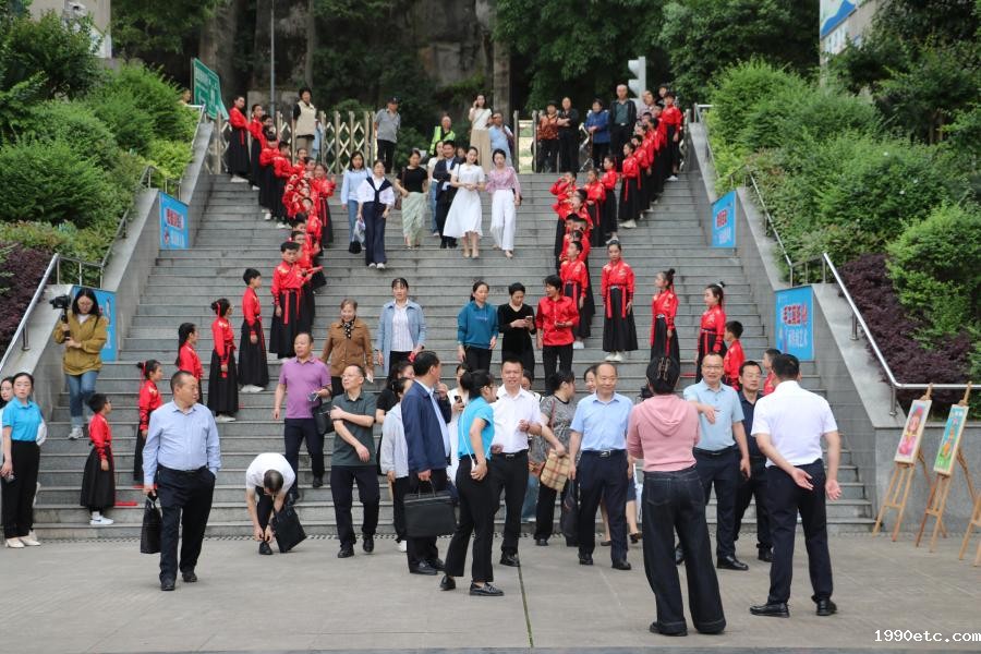 晨光初绽时,校门口与长梯处已铺开诗意长卷。身着传统汉服的学生列队而立,广袖拂过晨露,峨冠间流转细碎金光。他们以《诗经·鹿鸣》“呦呦鹿鸣,食野之苹”迎宾客入门,用《少年行》“相逢意气为君饮”展少年豪情,清越的吟诵声如春风化雨,让千年诗韵在校园门口流淌。长梯转角的诗配画展区更是匠心独运:《春晓》配带露桃花,《江雪》衬淡墨渔舟,剪纸姑娘们以刀代笔,在红纸上复刻“牧童遥指杏花村”的童趣,指尖流淌的不仅是技艺,更是对诗词的热爱与解构。