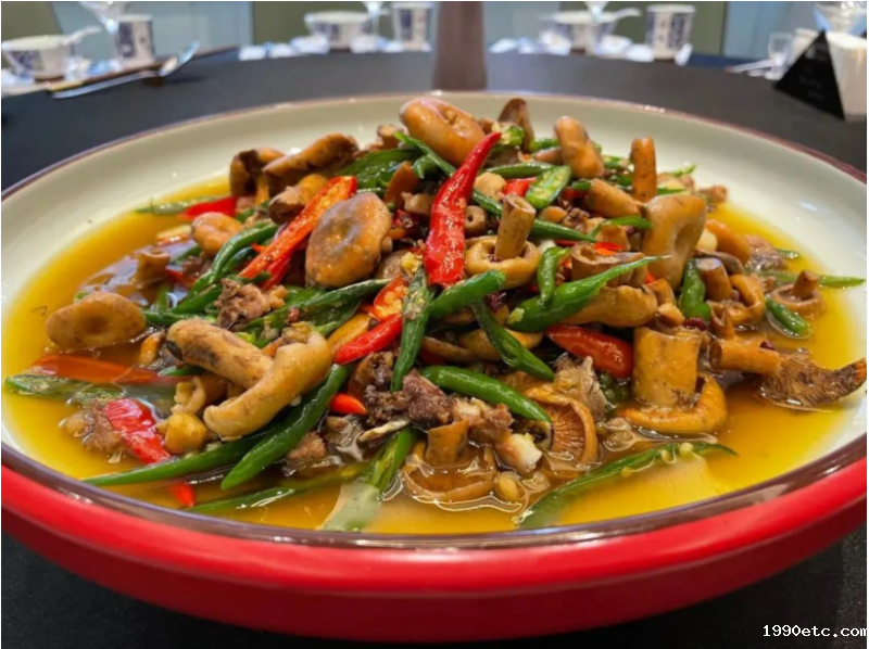 (二)炒锅入油八成热,将腌好的瓦灰鸡放入翻炒,再放姜块蒜瓣激发香味,加之平昌青花椒的清香鲜麻,释放小米辣和二荆条两种辣椒独特的鲜辣,配上山林里采摘的独有野生松菌,不仅做法独具一格,口味也是一流。