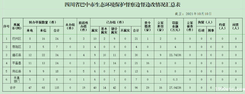 四川省巴中市生态环境保护督察边督边改情况汇总表