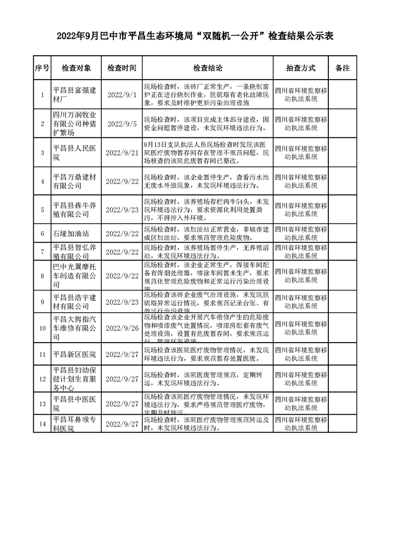 2022年9月巴中市平昌生态环境局“双随机、一公开”检查结果公示表
