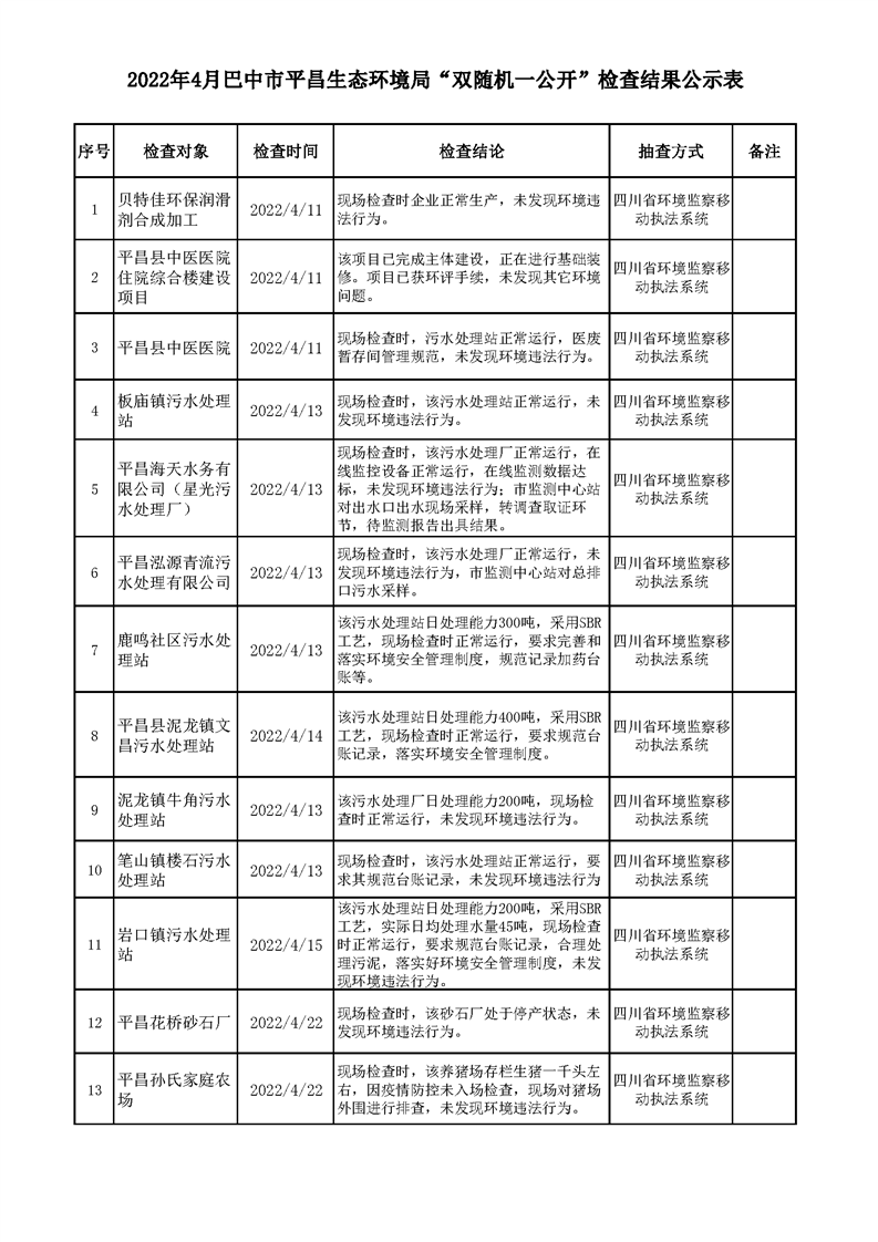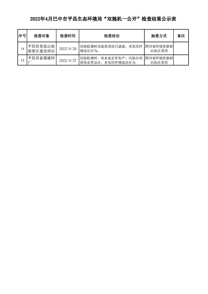 2022年4月巴中市平昌生态环境局“双随机、一公开”检查结果公示表