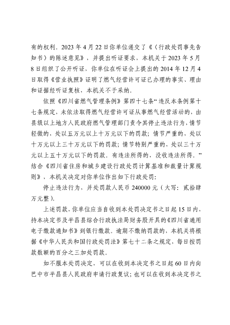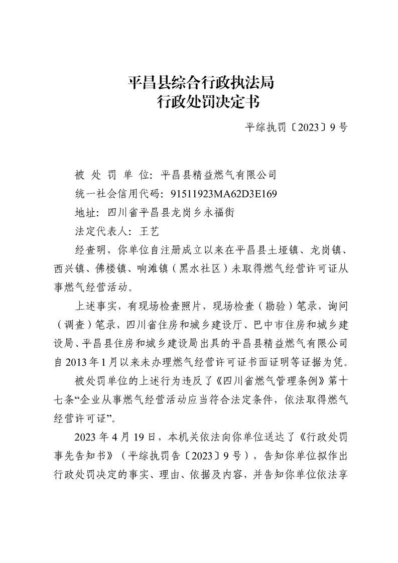 处罚决定书(开云体育足球官网精益燃气有限公司)