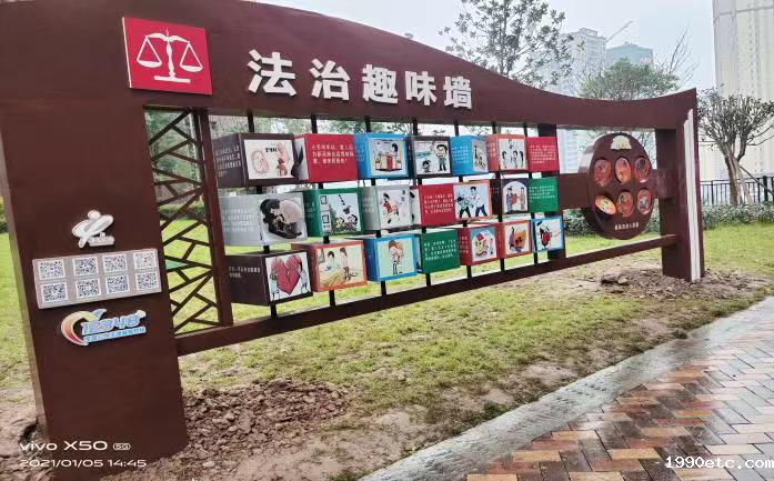 在兆润江山城小区,植入了法治趣味墙、法治灯箱、法治谜语,法治标语等元素,以图文形式展示了新中国历届领导人的法治思想,中国古代法治典故和近几年影响较大的司法案件。