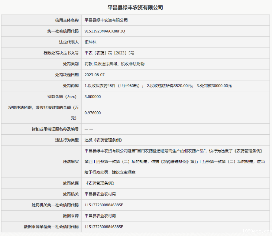 开云体育足球官网绿丰农资有限公司经营“冒用农药登记证号而生产的假农药产品”