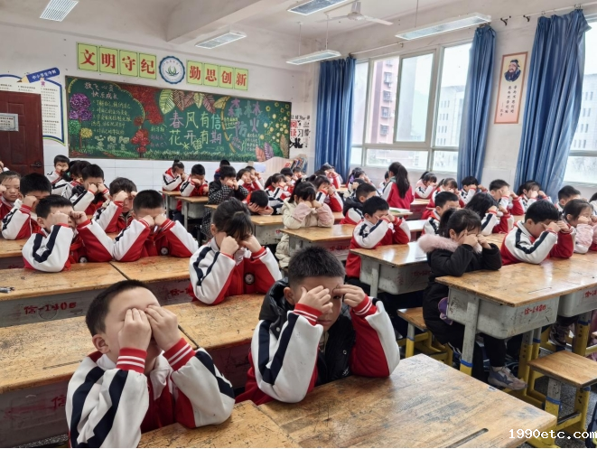 眼保健操被严格纳入学校考核。在舒缓的音乐声中,同学们认真找准穴位,规范按摩,老师们也会在旁监督指导,有效帮助学生缓解用眼疲劳,守护视力健康。