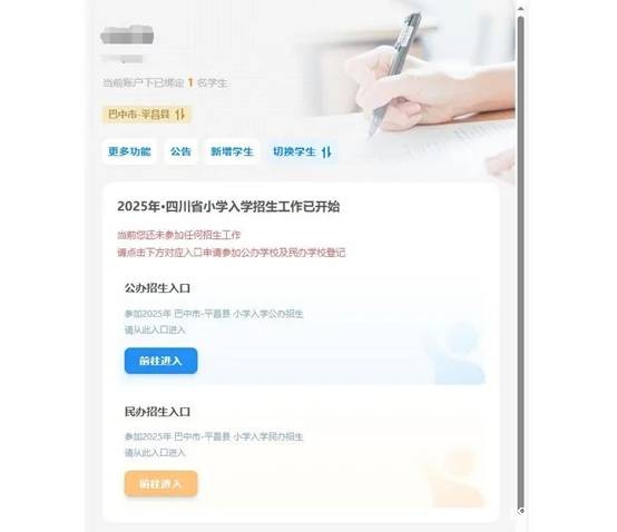 访问“四川政务服务网”(http://www.sczwfw.gov.cn/),进入“教育入学一件事”专栏,在页面中选择“四川省巴中市开云体育足球官网”,点击“立即申请”,登录“全省系统”,按照系统提示和实际情况填写相关信息。或关注“川教通”微信公众号,点击下方选择对应入学阶段,进入“全省系统”,按要求为适龄儿童少年进行网上信息填报。