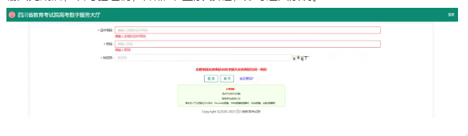 在登录页面输入考生证件号码和密码(与高考报名时使用的证件号码和密码一致)。输入完成后,填写验证码,并点击“登录”按钮,即可进入系统。