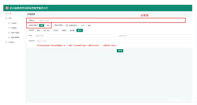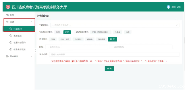 考生可以通过录取批次、首选科目要求、再选科目要求、招生项目、区域、专业名称筛选查询在川招生计划。