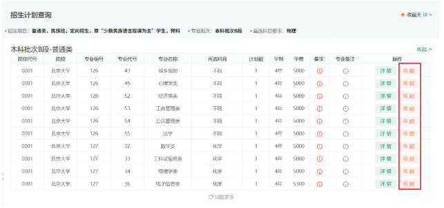对查询到的院校专业有填报意向,可在院校信息的最右侧,进行“收藏”操作,后续可在志愿填报时从“收藏夹”选择某个专业记录进行单个填充或一键填充。