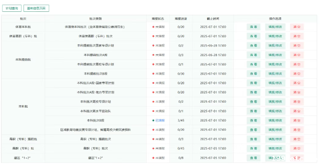 在志愿填报页面中,已列出符合考生类别和考生资格的批次,点击对应批次的“填报/修改”按钮,则进入到对应的志愿填报页。