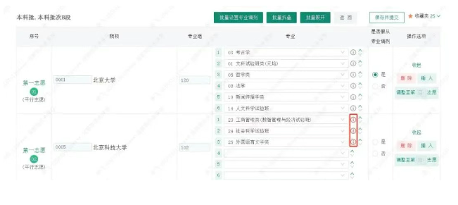 【插入】:如需在某个志愿前插入新的志愿,点击“插入”按钮,系统会新增一个志愿栏。