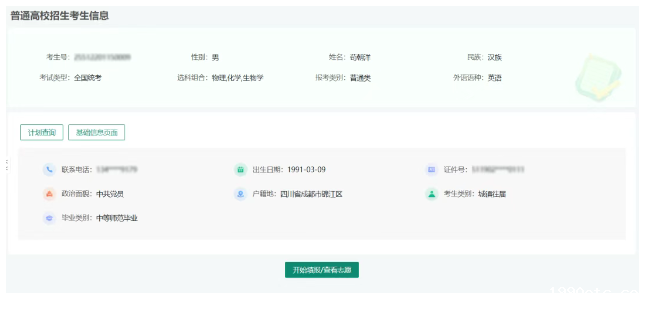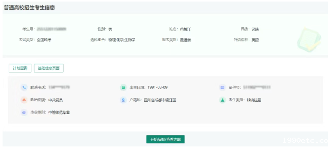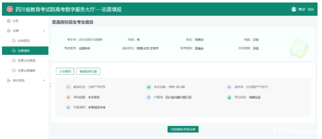 登录成功后,进入“志愿填报”页面,查看页面上方展示的考生信息,包括考生号、性别、姓名、民族、考试类型、选科组合、报考类别、外语语种等信息。请仔细核对,确保准确无误。