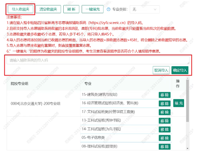 为方便考生填报志愿个数较多的平行志愿批次,“收藏夹”也支持粘贴“2025年四川省新高考志愿填报辅助系统”生成的志愿导入码导入,导入后可以通过“一键填充”功能进行志愿填报。“导入”功能目前可支持普通类的2个批次导入:本科批B段、高职(专科)批志愿。 在收藏夹页面点击“导入收藏夹”选项,进入志愿导入页面,按照提示信息进行导入,导入完毕后,可以通过“一键填充”功能进行志愿填报。