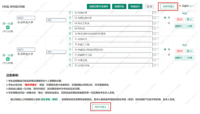 完成志愿填报后,仔细核对所填信息,确保准确无误。勾选“我已阅读以上所报院校公布的 招生章程(简章),知悉相关招生政策和录取规则。因未认真阅读所报院校招生章程(简章)而对录取产生的不利影响,由本人负责。”前的复选框,然后点击页面下方的“保存并提交”按钮,系统会提示志愿保存成功。