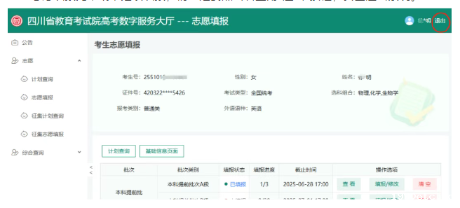 志愿填报完毕或不继续填报,请一定要点击右上角“退出”按钮,安全退出系统。