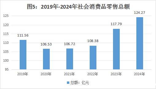 按城乡市场分,城镇消费品零售额106.32亿元,增长5.6%;乡村消费品零售额17.94亿元,增长4.9%。按行业划分,批发业实现消费品零售额26.36亿元,增长3.9%;零售业实现消费品零售额72.67亿元,增长4.9%;住宿业实现消费品零售额2.52亿元,增长3.0%;餐饮业实现消费品零售额22.72亿元,增长9.6%。
